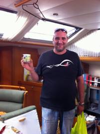 What??? Plus we have to stay at least three more days at 90 euros a day. One to wait for his services, a second for the job. Day Three to clean up from it. We don’t like marinas. We’ve been stuck here waiting for a repair that’s now done. But our anger is boundless. They’re coming on stronger. We see the biggies and more babies. Now, big ones will die but babies will grow up to be big ones and make more babies. The way of the world. Emanuele comes. All he does is pop the lids off 10 little cans of not-very-expensive-looking stuff and leaves. Meanwhile we have torn the boat apart, emptying drawers, cabinets, lockers—whatever empties—opening up floorboards, sofa cushions—whatever opens. Then we have to leave the boat for six hours, so we have to tell the Salty Dogs, so we can stay on their boat. They don’t seem to think ill of us.